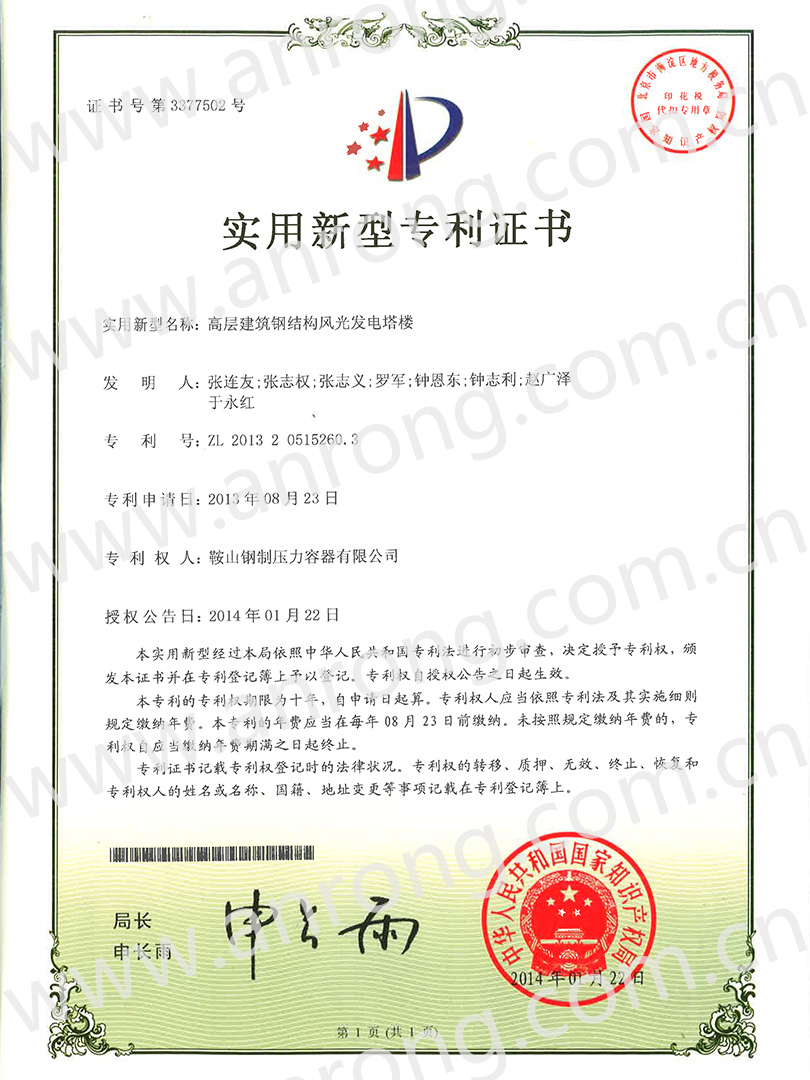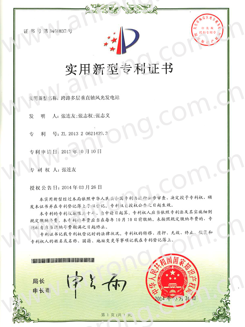跨路多層垂直軸風(fēng)光發(fā)電站-專利證書